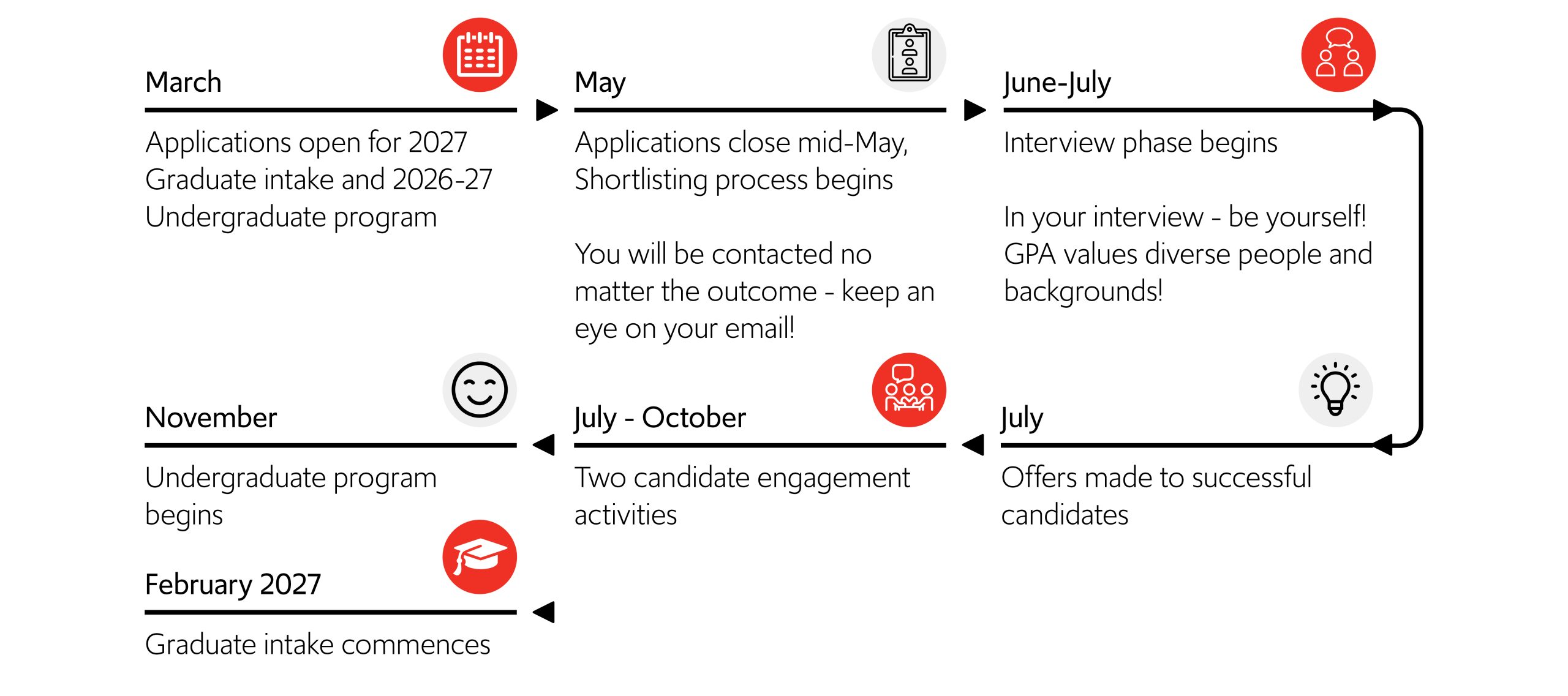 * The above process is based upon end of year graduation, GPA recognises that students may graduate mid-year. If you graduate mid-year, we welcome your application and can negotiate a suitable start date.